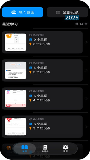 语学笔记的核心入口是其强大的智能内容捕获功能。用户只需通过截图导入或相册导入学习内容截图,应用内置的OCR文本识别引擎便会立即启动,进行精准的文字区域定位与识别。随后,AI智能分析模块将对识别出的文本进行深度处理,执行智能提取词汇操作,自动抓取出核心单词、其精准释义、标准音标及地道示例句子。这一自动化流水线彻底告别了手动输入的繁琐,将学习内容的录入效率提升了70%,让用户能专注于学习本身而非笔记整理。