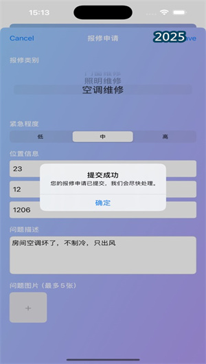 用户可通过直观的报修界面一键提交各类物业问题,系统提供水电维修、网络故障、家具损坏、照明问题等标准化报修分类,确保问题准确描述。每张服务工单自动生成唯一的工单编号并记录详细的问题描述、紧急程度与期望解决时间,为后续的任务分配与资源调度提供完整信息基础。报修流程优化使平均提交时间减少65%,极大提升了用户体验。