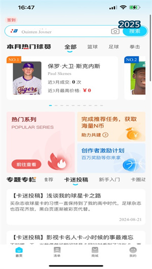NB球星卡App是一款基于智能数据系统的专业球星卡收藏管理平台,深度融合了AI图像识别与大数据分析技术。该平台通过创新的球星卡身份证checklist系统和多元数据整合架构,构建了一个集卡价查询、真伪鉴定、收藏管理、社区交流于一体的完整球星卡生态。其核心的一键识图查价功能能够快速获取卡片的准确市场价值,而N币激励体系则鼓励用户积极参与平台生态建设。NB球星卡App重新定义了传统球星卡收藏的方式,将分散的卡片信息和市场数据整合为系统化的数字服务,让每位卡友都能享受科学、便捷的收藏体验。