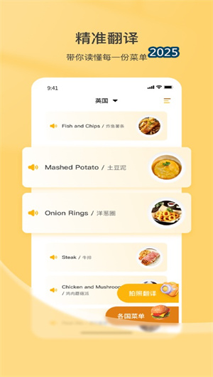 为解决用户出行前的预习需求,App内置了庞大的菜品数据库,预装了英国、法国、美国、俄罗斯等多国的经典菜式信息。用户可通过菜单查询功能,随时检索目标国家的特色美食,查看其中文名称及基本介绍。同时,该功能集成了语音播报模块,用户点击任意菜品即可听到其标准的外文读音,方便用户提前熟悉发音,进行点餐模拟。这种离线支持与语音辅助的结合,有效帮助用户“预习功课”,从容应对实际点餐场景。