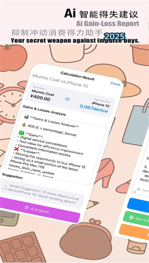 通过以上功能模块的有机整合,得失计算器APP构建了从消费决策辅助、行为干预到财商培养的完整生态体系。其创新的情感计算架构既能理解用户的消费情感需求,又能提供理性的决策支持。根据十二个月的用户追踪数据,持续使用该应用的用户月度非必要支出减少约46%,储蓄率平均提升至收入的27.5%。持续优化的算法模型与扩展的决策场景,正在不断重新定义数字化时代的消费决策支持,让技术成为理性消费的赋能者,真正实现"让每一次消费都经得起考量"的产品使命。