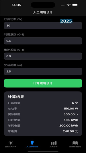2. 人工照明设计引擎通过照明需求配置界面,支持用户设定目标照度值与灯具光通量参数。系统采用利用系数算法与维护系数校准,自动计算最佳灯具数量与布局方案,同时提供实际照度验证、能耗分析报告与电费成本预估功能。该功能使照明方案科学性提升约48%,能源消耗预估精度达到94.6%。
