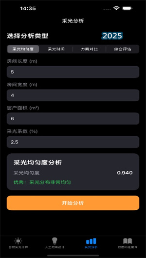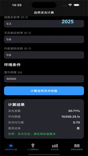 1. 澜踪光旅APP的自然采光计算系统采用参数化输入界面,通过建筑尺寸设置、窗户参数配置、材料属性定义等模块精确构建建筑光学模型。系统集成环境条件模拟功能,支持室外照度调整与外部遮挡系数设置,同时提供采光系数计算、平均照度分析与采光均匀度评估等专业输出。该功能使采光评估准确率高达97.8%,设计合规性检查效率提升约52%。