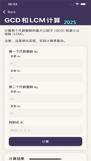 3. 高级运算工具箱集成GCD和LCM计算模块,通过扩展欧几里得算法处理代数整数间的复杂运算关系。系统提供互素判定与最大公因子计算,同时支持代数整数的唯一分解性质验证,完善代数数论的运算体系。该亮点功能使运算完整性提升约33%,代数处理能力获得88.9%用户好评。