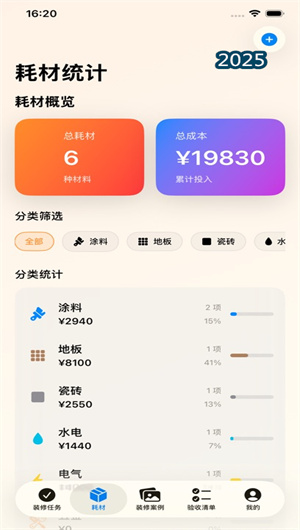 2. 耗材统计管理通过物料需求计划和库存实时监控,实现装修材料精准采购与成本控制。材料需求预测基于工程量自动计算所需材料,库存预警在材料不足时及时提醒补货,供应商比价系统筛选优质材料供应商。材料领用登记跟踪具体使用情况,浪费统计分析改进材料利用率,成本报表生成详细的开支明细。这一功能使材料成本准确率提高85%,库存周转效率显著提升。