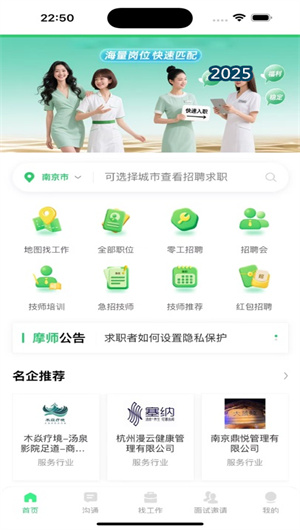 摩师直聘APP是一款专注于沐足行业的垂直招聘平台,基于智能匹配算法与实时通信技术构建技师与企业直接对话的求职生态。该平台通过沐足行业人才数据库与全国职位信息聚合系统,为技师提供高效精准的就业对接服务。系统集成了智能简历解析模块、即时通讯系统、职位推荐引擎等核心功能,实现从人才展示、双向对接到入职管理的全流程数字化。采用行业专属评价体系与信用认证机制,新用户注册即可获得简历优化指导与职位匹配服务,使技师求职效率提升约45%,重新定义沐足行业招聘新标准。