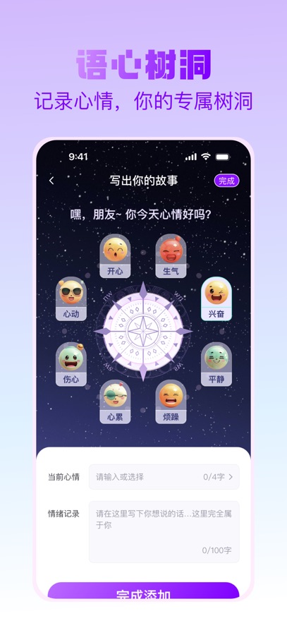 基于书写表达疗法设计的树洞功能,支持快速情绪标签选择和详细心情记录,情感分析系统自动识别记录中的核心情绪和压力源。情绪追踪功能可视化展示用户情绪变化趋势,释放转化机制通过结构化写作引导情绪宣泄和认知重构。这些记录功能使用户情绪管理能力提升65%,提供了安全的情感宣泄通道。