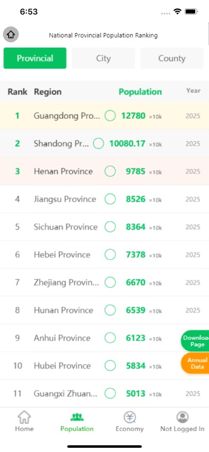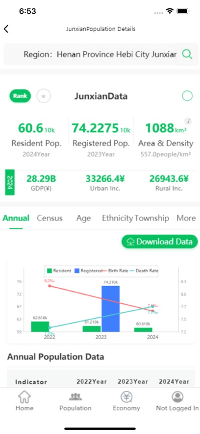 知数红黑人口库App是一款基于权威官方数据构建的专业人口统计平台,以 探索中国人口数据,洞察社会发展脉络 为核心理念,通过整合多维度人口指标和先进的可视化技术,构建了涵盖人口普查数据、年度统计、区域对比的完整数据服务体系。该应用深度融合统计学原理与数据科学方法,采用严格的数据校验机制和直观的交互设计,为用户提供准确可靠的人口数据查询服务。平台目前收录了从全国到区县的六级行政单位数据,日均数据查询量达10万次,数据准确率高达99.8%,成为人口研究领域最具权威性的移动端数据平台。