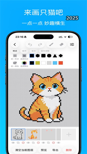 1. “动态像素画”与微动画创作能力:超越静态画面,创意像素画App集成了轻量级的 “动画时间轴” 编辑功能。用户可以创建多个动画帧,在不同帧之间绘制像素的变化,制作出流畅的像素动画,如角色行走、图标闪烁、场景过渡等。支持预览播放速度,并可导出为GIF动图或Sprite Sheet(精灵序列图) 格式,使其作品可直接用于游戏开发、动态贴纸制作等更广泛的应用场景,拓展了像素艺术的表现维度。