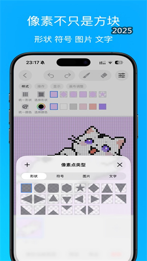 1. 无限元素化像素点与自由色彩管理系统:创意像素画App的核心突破在于其颠覆了传统像素点仅为方形色块的概念,引入了 “任意元素像素化” 的创新理念。用户可以将丰富的形状库(圆形、三角形、自定义矢量图形)、文字字符、各类表情符号(Emoji)、特殊符号,乃至导入的外部图像,经过算法处理后作为基本像素单元放置在画布上。每个这样的“像素点”都支持任意颜色的填充与描边,用户可通过高级调色板(支持RGB、HSB、十六进制码输入)或颜色滴管工具进行精准的色彩选取与调配,实现了在像素艺术框架内前所未有的视觉元素多样性与色彩表现力。