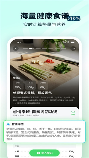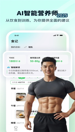 1. “饮食-训练”双环联动智能指导系统:七分厨房App超越了单纯的饮食记录,特色在于其实现了 “饮食”与“训练” 的智能联动。在用户的个人健康管家主页,AI不仅提供饮食建议,还会基于用户目标(如增肌需配合力量训练,减脂需关注有氧运动与热量缺口),给出相应的训练建议重点。例如,对于增肌用户,会强调蛋白质合成窗口期的营养补充与超量恢复原理;对于减脂用户,则会结合其饮食记录,评估碳水脂肪摄入的均衡性,并推荐合适的运动消耗方案,形成完整的健康管理闭环。