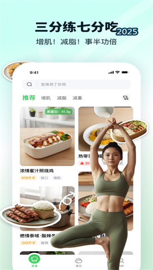 2. 智能化食谱库与精准营养分析引擎:应用拥有一个庞大的 “海量健康食谱库” ,所有食谱均按照增肌餐、减脂餐、低碳水食谱、高蛋白食谱等标签进行科学分类。每个食谱卡片都详细展示食材精确配比、分步烹饪指南、预估烹饪时间以及由营养分析引擎实时计算出的卡路里热量与详细营养成分表(包括蛋白质、碳水化合物、脂肪、膳食纤维及微量营养素含量)。用户可以根据自己的热量预算和营养素目标,像逛超市一样方便地筛选和规划一日三餐,让每一餐都吃得明明白白。