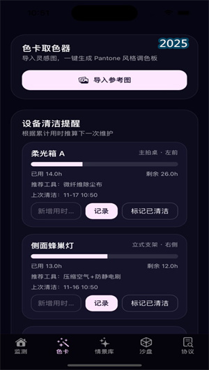 2. 设备联动与工作流程集成:应用致力于融入用户现有的工作流。它支持与部分智能蓝牙/Wi-Fi灯具进行连接,在虚拟沙盘中设计好方案后,可一键将光源强度、色温参数同步至实体灯具,实现数字方案到物理世界的快速落地。此外,应用提供灯具维护提醒功能,记录常用灯具的使用时长,提醒用户及时清洁或检查,保障设备状态最佳。所有布光方案、色彩设置均可生成项目文件保存或导出为PDF指导手册,方便团队协作与方案复用。