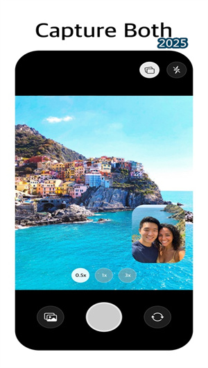 2. 创新双摄模式与画中画智能合成:本应用最具标志性的功能是其 “双摄模式”。此模式能够同时调用设备的前置摄像头与后置摄像头,进行实时同步视频流捕获。用户可在画中画、左右分屏、上下分割等多种PIP布局模板中自由选择,并实时调整小窗的位置、大小和透明度。该模式完美适用于反应镜头拍摄,在展示惊喜对象(后置主摄)的同时记录自己的表情(前置副摄);也适用于旅行Vlog,让地标风景与创作者笑容同框;甚至在合照时,摄影师也能通过后置摄像头构图并让自己出现在前置小窗中,不再缺席。