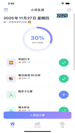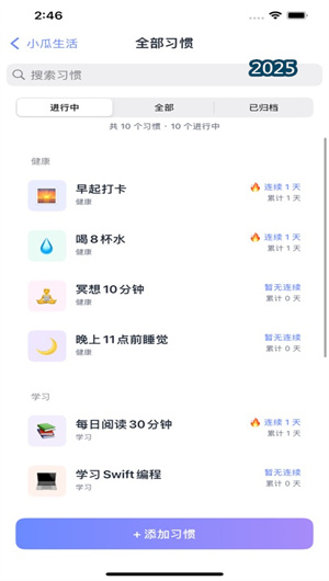 1. 智能习惯规划系统:用户可通过习惯创建向导自定义目标,系统将自动调用习惯强度评估模型与行为频率分析器,生成包含渐进式任务拆解、弹性打卡窗口及风险时段预警的个性化方案。该功能深度融合周期性复盘模块,每周自动生成习惯维持指数报告,并通过多维数据对比图表展示成长轨迹。用户还可启用智能替补规则应对突发状况,确保习惯链条的连续性,系统将根据缺席补偿逻辑自动调整后续计划,维持整体进度的稳定性。