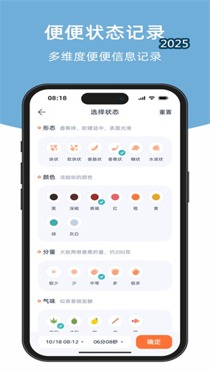 1. 多维度排泄事件精细记录:用户可通过极简记录面板,快速记录每一次排泄事件。针对便便信息,可详细选择形态分类、颜色光谱、分量等级、气味强度,并记录是否存在出血标记、排便感觉(如困难、急迫)及发生地点。针对小便信息,则可记录尿液色度、单次估算量、气味与透明度、泡沫情况及是否含血。所有数据均以时间戳事件流的形式存入本地加密数据库,并支持通过备注字段添加饮食、情绪等关联信息,形成一份完整的个人排泄健康档案。