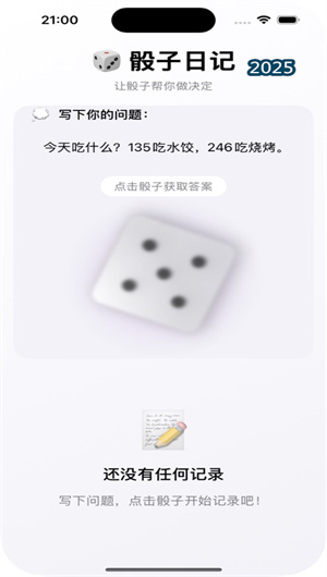 1. 即时随机决策生成与趣味交互:用户在骰子日记中,只需在简洁的输入框内录入一个二元或多元选择题(如“晚餐:A.面条 B.米饭 C.饺子”),然后点击屏幕中央拟物化设计的 “3D虚拟骰子” 。应用内置的高熵随机数算法将瞬间模拟真实骰子的物理随机性,生成一个1至6之间的随机点数结果。这个结果会以醒目的动画形式呈现,为用户提供直接的 “骰子建议” 。整个流程在数秒内完成,将决策过程从一个纠结的内耗,转化为一场充满悬念和趣味性的微型仪式。