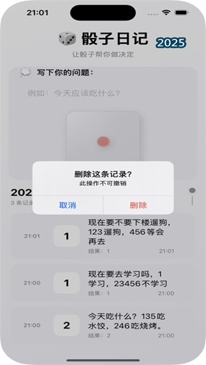 2. 自动化决策日记归档与时间线浏览:每一次骰子投掷并非雁过无痕。系统会自动将完整的决策三元组——即 “选择问题”、“骰子点数结果” 以及精确的 “决策时间戳”——打包保存为一条不可篡改的本地日记条目。所有条目按时间倒序排列在 “决策历史流” 页面,形成一个独特的个人选择日记本。用户可以轻松回溯,查看过去某一天自己为何事纠结,以及骰子给出了怎样的“天意”,这种决策轨迹的可视化为平凡生活增添了意想不到的回味与叙事感。