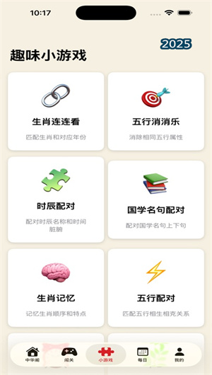 3. 交互式趣味小游戏与即时反馈机制:为了巩固知识并提升学习乐趣,App开发了多款主题化迷你游戏。例如,生肖连连看不仅考验记忆与反应,更在配对过程中强化生肖与地支的对应关系;五行消消乐则让用户在消除相同属性方块时,直观感受五行能量的聚合与消散原理。每款游戏都内置教学性游戏设计,在时辰配对游戏中,配对成功后会播放该时辰当令脏腑的养生要点动画。所有游戏均提供即时绩效反馈,包括文化积分奖励、知识点弹幕提示及错误解析,将娱乐与教育无缝融合。