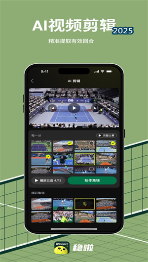 1. 全自动AI视频采集与智能集锦生成:稳啦App的核心入口是其高度智能化的视频捕获引擎。用户开启录制后,应用利用设备摄像头并结合高性能图像稳定算法,自动追踪网球及运动员在场地内的运动轨迹。系统通过目标检测与跟踪算法,精准识别并标记出每一次有效击球回合的开始与结束。录制完成后,云端AI剪辑模块会立即对视频进行处理,依据击球精彩程度算法(综合评估球速、落点、回合拍数等),自动筛选并生成高质量的比赛集锦短片。该短片支持一键添加慢动作特效、数据标签叠加(如实时球速)及背景音乐,极大简化了视频后期制作流程,让用户专注于运动本身。
