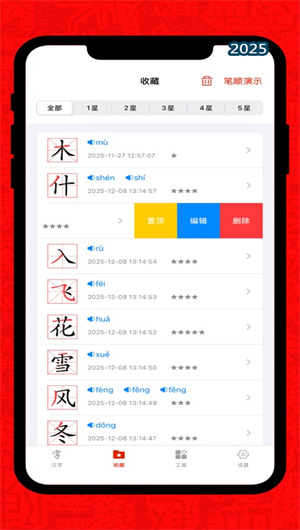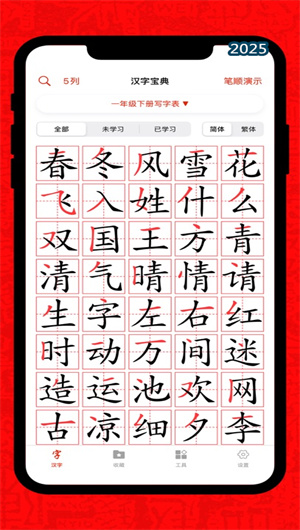 3. 个性化学习系统与教材同步功能:汉字宝典提供强大的个性化学习路径配置。用户可根据自身水平,在辅助性米字格与挑战性田字格之间自由切换书写背景;并可选择跟随式、笔画式或描红模式三种不同的笔顺提示方式。应用深度整合小学语文教材生字库,完整收录各版本教材的写字表、识字表及词语表内容,并支持五四学制与六三学制的灵活切换,确保学习内容与课堂进度无缝衔接,成为学生课后巩固与教师课堂辅助的得力工具。