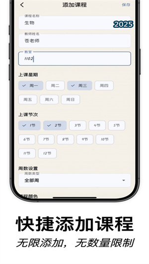 2. 全功能课程数据编辑与管理功能:应用提供强大且直观的课程信息管理套件。用户可通过手动课程录入表单灵活添加每一门课程的详细信息,并利用课程卡片编辑界面随时进行修改或删除。针对规律性课程,批量课程设置工具支持用户快速复制课程模板至指定周期(如单双周、每周固定几天),极大提升排课效率。所有课程支持自定义颜色编码系统,用户可为不同学科分配专属色块,从而在课表视图中实现快速的视觉科目分类辨识。