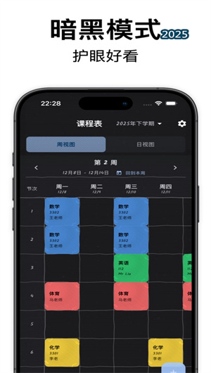 1. 智能双视图课程展示与导航功能:方格课表的核心是其高效的双视图展示系统。在周课表全景模式下,应用通过时间轴网格布局算法,将整周课程以清晰的时间区块形式呈现在可视化周历画布上,让用户对课程分布、空档时段一目了然,便于进行宏观的学习计划统筹。一键切换至日课表聚焦模式后,界面将转化为以当日为核心的时间线详细视图,突出显示每节课的具体名称、地点、教师及用户自定义的课程颜色标签,确保上课关键信息无遗漏,实现从全局到细节的无缝衔接。