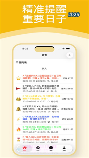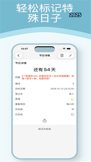 应用的核心功能是其灵活强大的日期事件创建系统。用户可通过极简的输入界面,快速添加如家人生日、结婚纪念日、项目截止日等任何重要日子。系统内置智能日期解析器,可自动识别并格式化各种日期表述。在提醒设置上,提供高度自定义的多通道提醒策略:用户可为同一个日子设置多个预提醒节点(如提前1周、3天、当天),并选择推送通知、短信提醒甚至邮件提醒等不同方式。对于周期性事件,支持按年、按月、按周的复杂重复规则设置,实现“一次设置,终身提醒”。