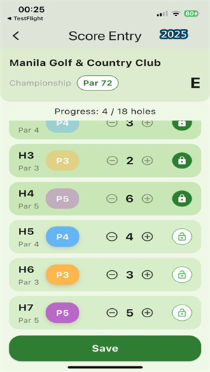 在打球过程中,用户可在每个球洞结束后,于对应的按洞输入界面便捷地录入该洞的实际杆数。应用界面设计极致简洁,确保在移动中也能快速完成记录。在用户录入的同时,后台的实时计分统计引擎即刻启动,动态计算并显示前九洞总杆数、后九洞总杆数、当前总杆数以及与标准杆的差值。此外,系统还可实时统计标准杆上果岭率、推杆总数等进阶数据(需额外录入推杆数),让用户对当轮表现有即时、量化的认知。