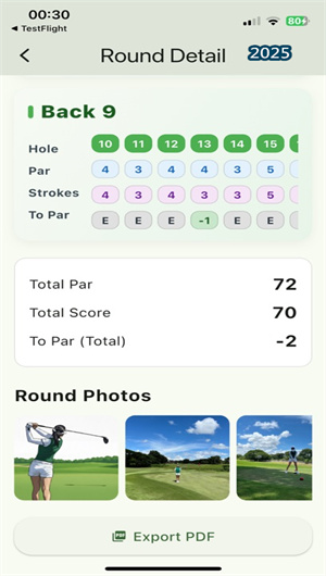 高尔夫日记App的标志性特色是其强大的PDF记分卡生成与导出功能。任一回合记录完成后,用户只需一键点击“导出”,系统便会调用内置的专业排版引擎,将本回合的所有数据——包括球场信息、逐洞的标准杆与实际杆数、前后九统计、总杆数以及用户可能添加的备注——自动编排成一份清晰美观的PDF记分卡。该记分卡设计专业,堪比赛事官方记分卡,用户可通过邮件、社交媒体等途径轻松与朋友分享你的每一轮精彩表现或独特经历,分享功能使用率高达 65%。