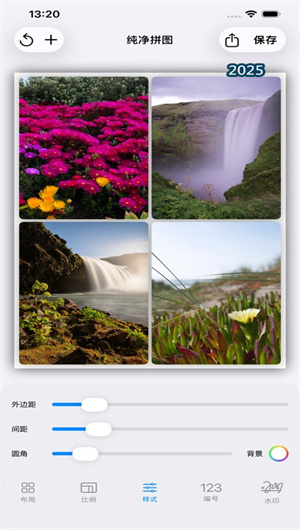 我们坚信,细节是彰显品味的关键。《纯净拼图》提供了专业级的样式设置面板,赋予用户对作品每个像素点的控制力。用户可以精确调整图片内边距(控制图片间的疏离感)与画布外边距(营造整体留白意境),精细到像素。画布背景不仅支持纯色填充和线性/径向渐变色,更可启用 “智能取色” 功能,从所选照片中自动提取主色作为背景,确保色调和谐。此外,图片圆角弧度可无极调节,从现代感的直角到温馨的圆角,风格随心切换。全尺寸画布预设覆盖了主流社交平台规格,如 1:1 的Instagram方形、4:3/3:4 的通用帖子比例以及 16:9/9:16 的短视频封面尺寸,确保作品在任何平台都展示出色。