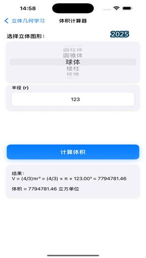App内置的 “智能参数化图形计算器” 是其最具实用价值的功能之一。用户只需在界面中根据提示,选择图形类型(如圆锥体),并输入相应的参数(如底面半径、高),计算器便会自动调用对应的 “体积公式” 或 “表面积公式” 进行运算。更为出色的是,它并非简单地输出结果,而是会以分步展开的形式,清晰展示完整的公式计算过程,包括代入数值、中间运算步骤直至最终结果。这相当于一位随时在线的“解题老师”,让用户不仅知其然,更知其所以然。计算器支持上述 8种常见立体图形的快速切换与计算。