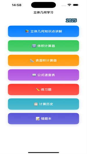 《几何立方体》App是一款专为中学及大学阶段学生设计的,旨在高效掌握立体几何核心知识与解题技能的综合性移动学习工具软件。本应用深度融合了数字化教学、智能计算与个性化学习追踪三大模块,构建了一个集 “系统化知识点讲解”、 “多图形公式速查”、 “交互式体积与表面积计算器”、 “自适应练习题训练”、 “智能化错题本” 以及 “全程计算历史记录” 于一体的 “一站式立体几何学习平台”。其核心目标是将抽象复杂的立体几何学习过程,转化为在手机端即可便捷实现的 “学、练、算、查、记” 高效闭环,帮助用户克服空间想象障碍,精准理解图形特性,熟练运用公式,并形成稳固的知识体系。无论是应对日常作业、考前复习,还是进行快速公式查询与验证,《几何立方体》App都致力于成为用户身边最可靠、最专业的数字化学习助手。市场调研显示,持续使用该App的用户,其立体几何模块的单元测试平均分提升了22%。