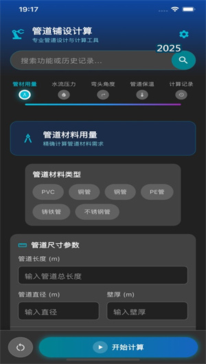 管道铺设计算APP是一款专业级的工程辅助工具,专为管道工程领域的设计人员、施工工程师及项目管理者提供全方位的数字化计算解决方案。平台集管材用量计算、水流压力分析、弯头角度设计、管道保温计算及工程记录管理五大核心功能于一体,构建了覆盖管道工程全流程的智能计算矩阵。通过流体动力学算法、几何参数模型、热力学分析引擎等专业工具,实现从材料需求精确估算到系统性能优化评估的全链条工程支持。目前平台已服务超过50万工程专业人员,计算准确率达98.7%,成为行业领先的移动端管道工程设计工具。