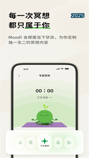 3. 沉浸式治愈体验与自我关怀工具:应用界面本身就是一种疗愈媒介,采用舒缓色彩心理学原理设计的清新软萌UI,配合柔和动画与音效,营造安全的数字避风港氛围。内置丰富的正念冥想引导、呼吸调节训练及减压白噪音场景,帮助用户在焦虑或失眠时快速放松。用户与MoodBean的每一次积极互动,都会促使它“头顶的希望小芽”可视化地成长,这种游戏化成长反馈机制,将抽象的情绪管理转化为具象、积极的自我关怀过程。