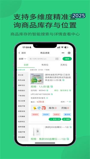 2. 商品与库存一体化管理功能基于云端商品主数据中心,商家可通过批量商品导入模板快速上架数千个SKU,系统自动生成符合医疗器械管理规范的标准化商品信息卡片,包含医疗器械注册证号、适用范围、禁忌症等专业字段。库存管理模块采用多仓联动库存模型,实时同步线上线下库存数据,当库存低于安全库存阈值时自动触发预警。智能批次管理系统遵循医疗器械“先进先出”原则,自动追踪商品效期,近效期商品会在库存预警面板高亮显示并建议优先出库,有效降低过期损耗风险。