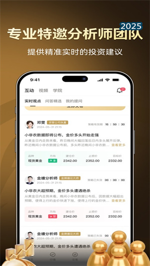 应用集成了 “市场脉搏速递” 功能,为用户提供全球头条财经资讯的7x24小时实时流。这些资讯经过智能标签化处理,与对应的金银价格波动图表关联展示,帮助用户快速理解市场异动的背后逻辑。更重要的是,平台特邀顶级分析师团队驻场,通过 “专家领航策略” 专栏,发布包含图文、视频直播在内的深度市场解读、技术分析报告与具体的交易策略建议。用户不仅能查看独家策略,还能订阅特定分析师的观点,实现信息的高效过滤与个性化接收,使复杂的市场研判变得简单高效。
