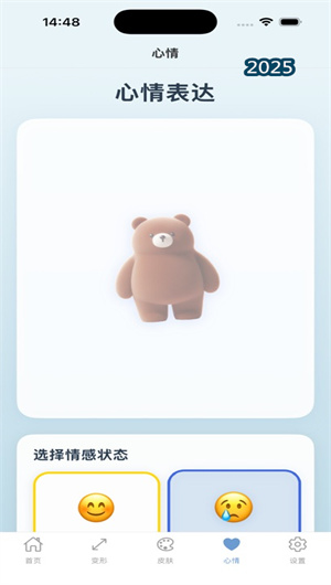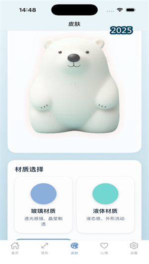 为满足用户的个性化表达需求,透明扭扭熊内置了丰富的 “情感调色板”与“质感材料库” 。用户可以从柔和色谱、明亮光谱或灰阶色调中选择喜爱的颜色为扭扭熊整体或局部上色,表达情绪的冷暖或明暗。材质方面,提供了如毛绒质感、晶莹光泽、橡胶弹性、金属冷感等多种预设材质,甚至支持将自定义图片映射为扭扭熊的表面纹理,让情感的“触感”也变得可视化。用户可以将不同材质与颜色组合应用,创造出独一无二的个性化扭扭熊形象,并保存至心情创作画廊。