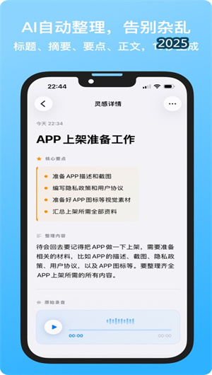 这是闪念区别于普通录音笔或简单转写工具的核心功能。在获得原始转写文本后,应用的 “AI文本理解与结构化模块” 开始工作。首先,它会分析整段话的核心主题,并智能生成一个简洁贴切的标题。其次,它会提取核心论点与逻辑脉络,自动生成一份概要性的摘要,帮助用户快速把握此次录音的核心价值。更重要的是,它能将可能杂乱无章的口述内容,进行段落划分、要点归纳,并去除冗余的口语化表达(如“嗯”、“啊”、重复语句),整理成逻辑清晰、易于阅读的结构化笔记,仿佛是经过用户自己稍加润色的草稿。