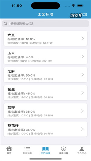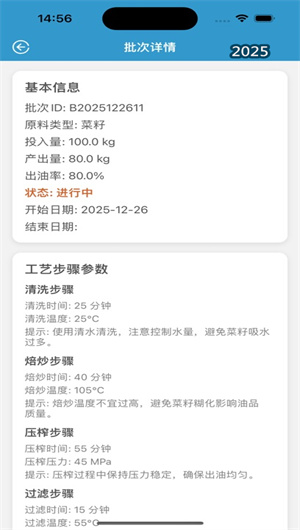 1. 全流程批次化生产记录与工艺参数管理:本功能是应用的基石,为每一批次的油料加工建立独立的数字生产档案。用户可便捷地记录油料信息(如品种、产地、重量、含水率)、加工步骤(如清理、炒籽、压榨、过滤),并在每个关键步骤中录入实时的工艺参数,如炒籽温度、蒸料时间、压榨压力与时长等。系统支持文字、数字录入,并可拍照上传关键节点状态。所有记录按时间轴清晰排列,形成一份完整的、可随时回溯的电子加工日志,确保“每一步操作都有迹可循”,为工艺标准化与问题追溯提供了坚实的数据基础。