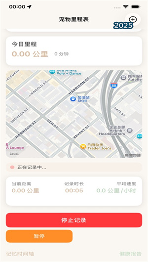 1. 全自动智能里程记录与多场景分类系统:本应用的核心是智能里程记录引擎。它利用设备传感器,能自动识别用户与宠物是否处于出行状态(如步行、跑步),无需手动开启或关闭,实现无感记录。在记录过程中,应用会精准记录下完整的出行路线、总距离、时长及平均速度,并支持离线记录以备网络不佳时使用。系统支持按场景化分类进行归档:如标记为日常遛弯、宠物就医、周末宠物旅行或与伙伴的宠物社交活动。针对不同宠物类型(猫/狗)及品种,其运动算法会进行微调,确保数据记录的合理性与参考价值。所有实时数据(当前里程、时长)在记录界面清晰可见。