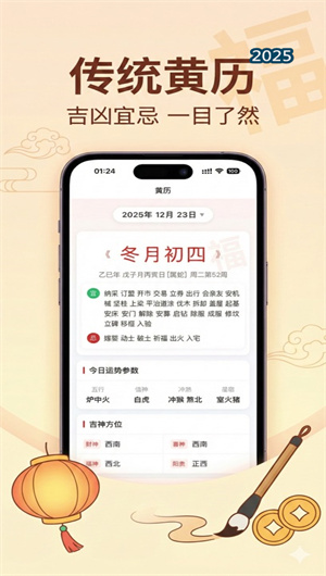2. 传统择吉文化与现代信息融合呈现:应用深度整合了传统老黄历的智慧精华,提供了专业的每日宜忌查询功能。每日均会清晰列出“宜”与“忌”的若干事项(如宜搬家、忌动土),并附有简明的择吉指引。同时,进一步提供更专业的五行冲煞信息,例如当日的天干地支、五行属性、冲煞方位与所冲生肖,满足部分用户在婚嫁、乔迁、开业等重大事宜时参考传统习俗的需求。这些内容以清晰、客观的方式呈现,不故弄玄虚,作为传统文化的一种信息补充,供用户自行判断与参考。