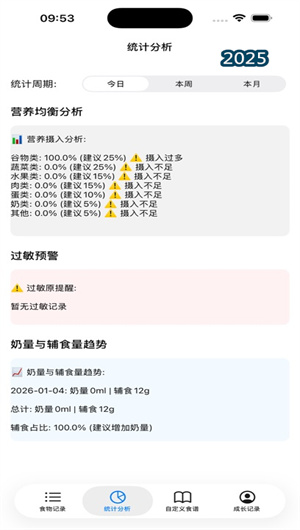 基于持续的喂养记录,应用的 “营养分析中心” 能够对宝宝的膳食结构进行初步评估。系统利用食物营养成分数据库,估算宝宝每日/每周摄入的总热量、蛋白质、脂肪、碳水化合物及关键营养素(如钙、铁、维生素D)的大致水平,并与对应月龄的膳食营养素参考摄入量进行比对,以图表形式呈现潜在过剩或不足的营养素。家长可据此生成周期性的 “宝宝膳食营养报告” ,作为与儿科医生或营养师沟通的客观依据,辅助调整喂养策略。