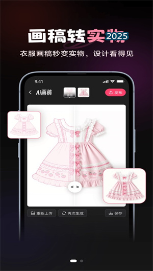 2. 全息AR实景试穿引擎 是将二维设计转化为三维体验的核心技术。用户完成设计后,可一键启动 AR试穿模式,应用会调用设备摄像头,通过 骨骼关键点识别 与 实时姿态追踪 技术,将设计好的虚拟服装精准“穿戴”在用户身上或指定的 3D虚拟模特 上。引擎搭载 智能布料物理模拟,能根据用户的动作(如转身、跳跃)实时计算裙摆的摆动、披风的飘动等效果,配合 环境光渲染,使虚拟服装与真实场景的光影融为一体,让 “美丽,真实可见” 。该功能支持视频录制,用户可制作自己的 “时装秀短片”。