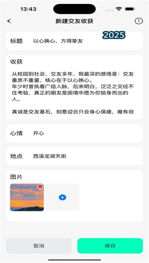 2. 社交关系深度分析与智能提醒体系。应用不仅记录事件,更管理关系。基于持续的交友记录,平台为每位联系人构建动态关系画像,包含互动频率、共同兴趣、情感互动深度等维度。系统会智能分析关系状态,例如,当检测到与某位志同道合的朋友互动频率下降时,会温和提醒用户“也许可以约一次咖啡”;或在用户记录了一次特别愉快的活动后,建议“可将这位朋友加入您的‘月度必见清单’”。这种 “关系健康度” 管理,帮助用户更用心地维护宝贵的社交连接。