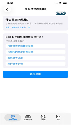 应用的核心是“思维训练馆”,它提供了一套完整的阶梯式训练体系。该体系由基础启蒙营、场景进阶馆和高阶实战营三大模块构成,难度与复杂度逐级提升。每个训练关卡都紧密围绕职场、学习、生活、商业等具体应用场景设计,并在其中深度融入多种逆向思维方法的讲解与演练,包括但不限于反证法、换位思考法、因果倒置法、逆向推理及假设反转等。通过循序渐进的引导式练习,用户能够逐步建立起对逆向思维认知的系统性理解,并掌握在不同情境下调用相应思维工具的能力。
