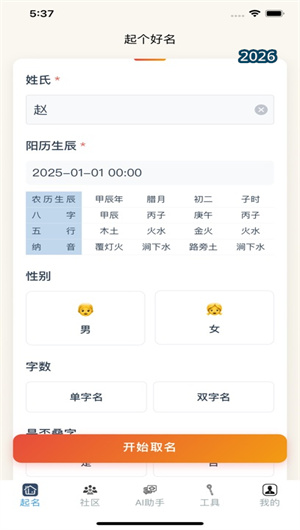 初临起名的核心功能始于对新生儿生辰八字的精密分析。用户输入精确的出生日期与时间后,应用内置的命理计算引擎会自动推算出对应的天干地支,并进一步分析其五行喜用神与五行缺旺情况。基于此分析,系统在后续的名字生成过程中,会优先推荐能够对命理五行起到平衡补益作用的汉字。用户可以明确指定五行偏好(如加强“金”属性或调和“水木”),系统将根据汉字五行属性库进行精准筛选与组合,确保生成的名字在传统文化层面具备积极的调和作用,为名字奠定吉祥的先天基础。