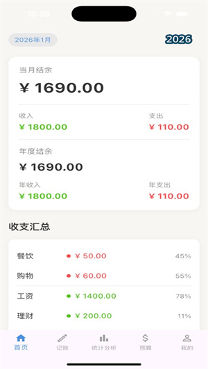 在数据记录的基础上,工蜂记账提供了强大的可视化统计图表功能,帮助用户从数据中获取洞察。系统自动按日、周、月、年不同周期,生成清晰的环形图、柱状图和趋势折线图,直观展示收入与支出的占比结构、变化趋势及对比情况。用户不仅可以查看总支出的分类构成,还能深入分析某一特定分类(如“娱乐”)在不同时间段内的消费波动。所有图表均支持点击钻取,查看明细数据。系统定期(如每月初)自动生成的图文财务报表,为用户提供了结构化的财务回顾,使其对自身消费行为模式与资金流向一目了然。