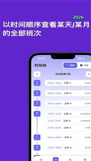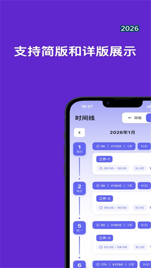 时积APP提供日历网格视图与时间线视图两种核心数据呈现方式。日历视图采用自适应布局算法,每个日期单元格内可智能显示用户定制的工作名称、开始时间、当天收入与总工时等关键信息,最高支持四项内容的动态组合显示。时间线视图则通过时序渲染引擎,按时间顺序还原用户某日或某月的完整班次节奏,支持简版概览与详版展示两种模式。用户可通过长按日期快捷操作或点击记录编辑面板快速创建或修改工作条目,所有更改实时同步至本地工时数据库。