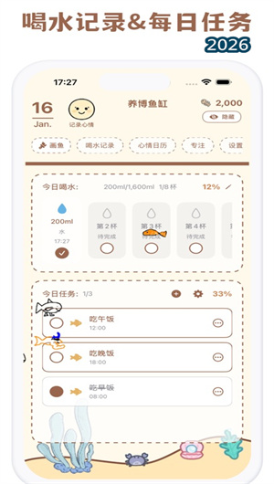 鱼缸并非静态画卷,而是一个需要能量维持的虚拟生态系统。应用的核心驱动机制是将用户的现实健康行为转化为虚拟世界的能量。当用户完成一次饮水记录打卡、完成一段专注番茄时钟或达成一项每日健康挑战时,系统会奖励相应数量的能量水滴。这些能量水滴是鱼缸内生命维持系统的燃料,用于兑换鱼食、清洁滤材、补充氧气,甚至解锁新的绘图工具或稀有装饰组件。若长期忽视健康任务导致能量枯竭,鱼缸环境将变得暗淡,小鱼活力下降,形成温和的负向反馈以激励用户。